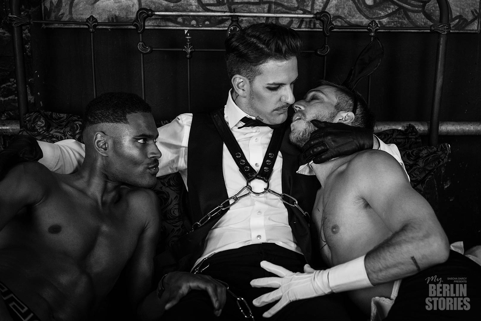 Juan and Javi settled down next to Dante, his arms embracing them both while they started investigating his body staring at him in the eyes. It was all very erotic, a private scene in a crowded techno club, and Martina could not take her eyes off of them. As the morning progressed, the temperature on the bed kept rising until both guys in Dante’s arms were naked. More splits, more drinks, loud laughter and lots of kissing and stroking, Dante meanwhile, very much the master of ceremonies, still fully dressed and in control of the situation. Meanwhile, James, an American man in Berlin was dancing nearby, his naked torso glittering with sweat, transfixed on the scene on the bed. Dante caught his glance and held it firmly. James locked eyes, still continuing to dance.
